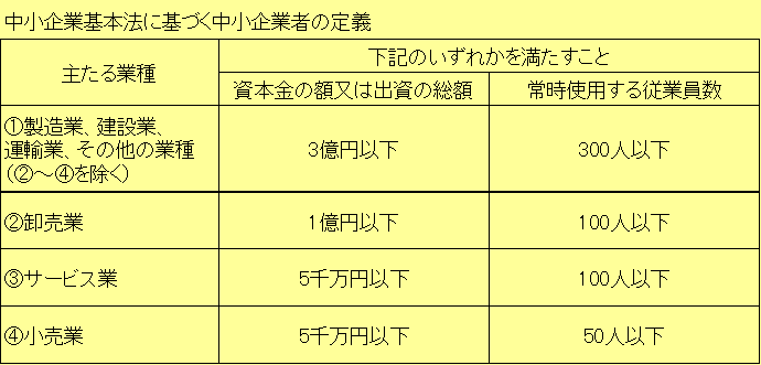 (1)中小企業基本法に規定する中小企業者(下記表参照)及び常時雇用する従業員数が300人以下の一般社団法人、一般財団法人、医療法人、社会福祉法人、NPO法人 等